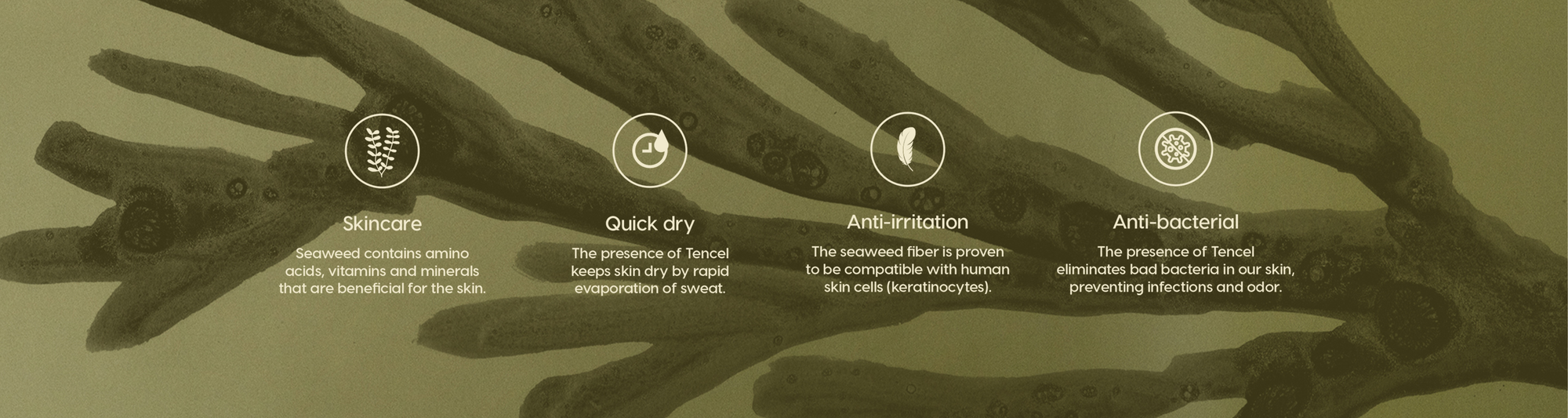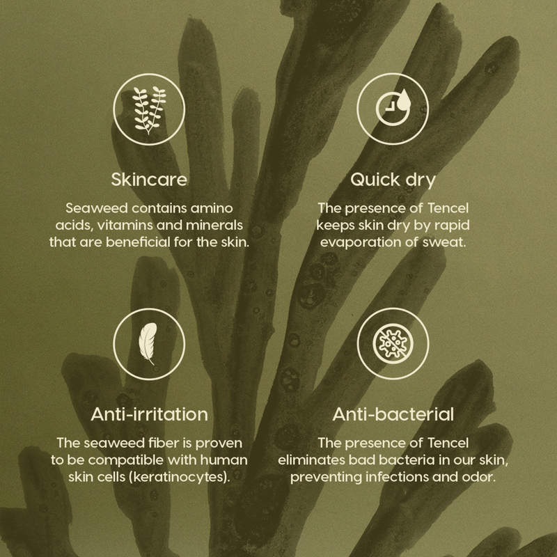 Our new Collection is made from a blend of seaweed-based fiber (Seacell) and wood-based Fiber (Tencel™ Lyocell), for an incredibly cooling, nourishing, and comfortable wear.