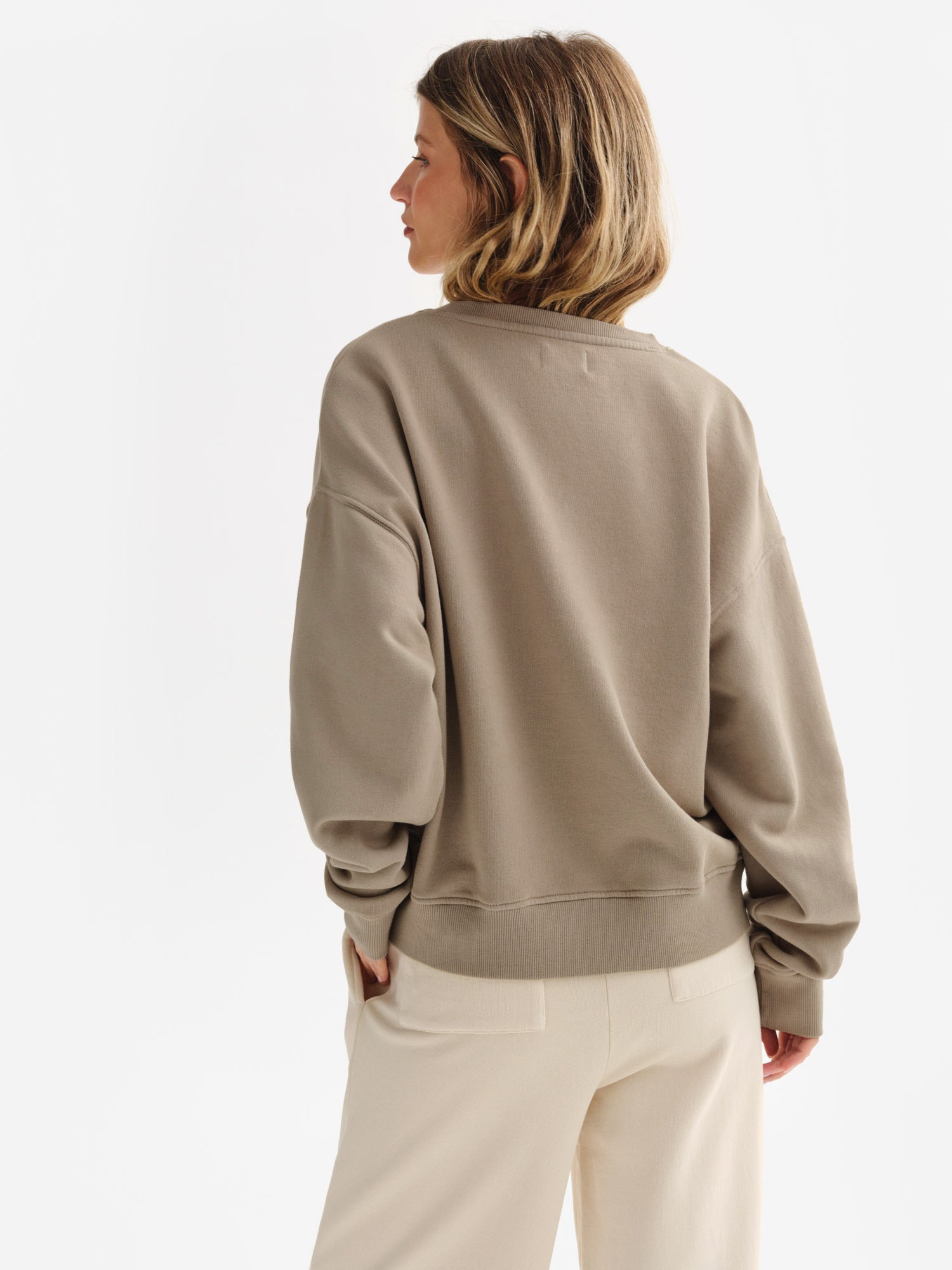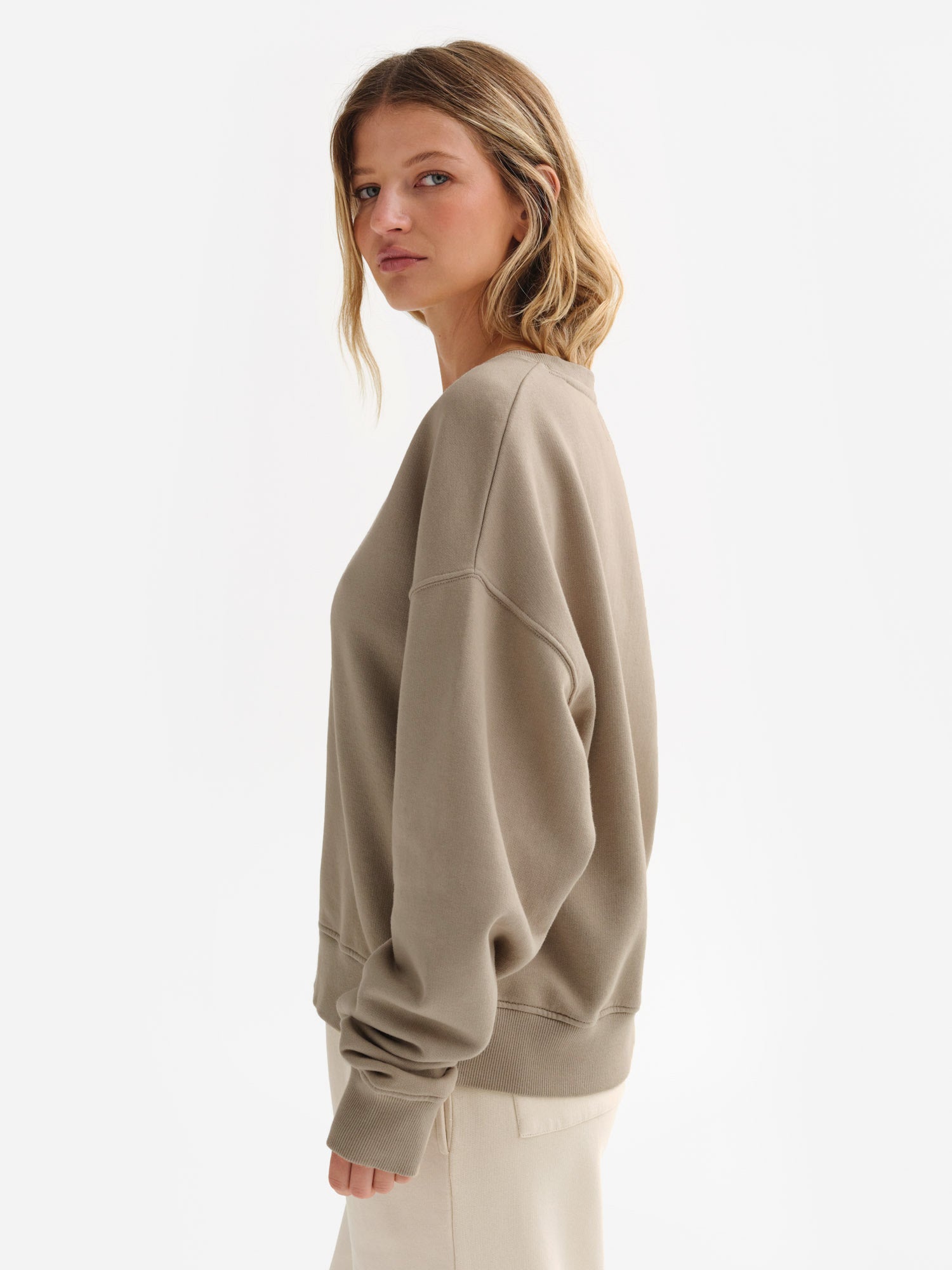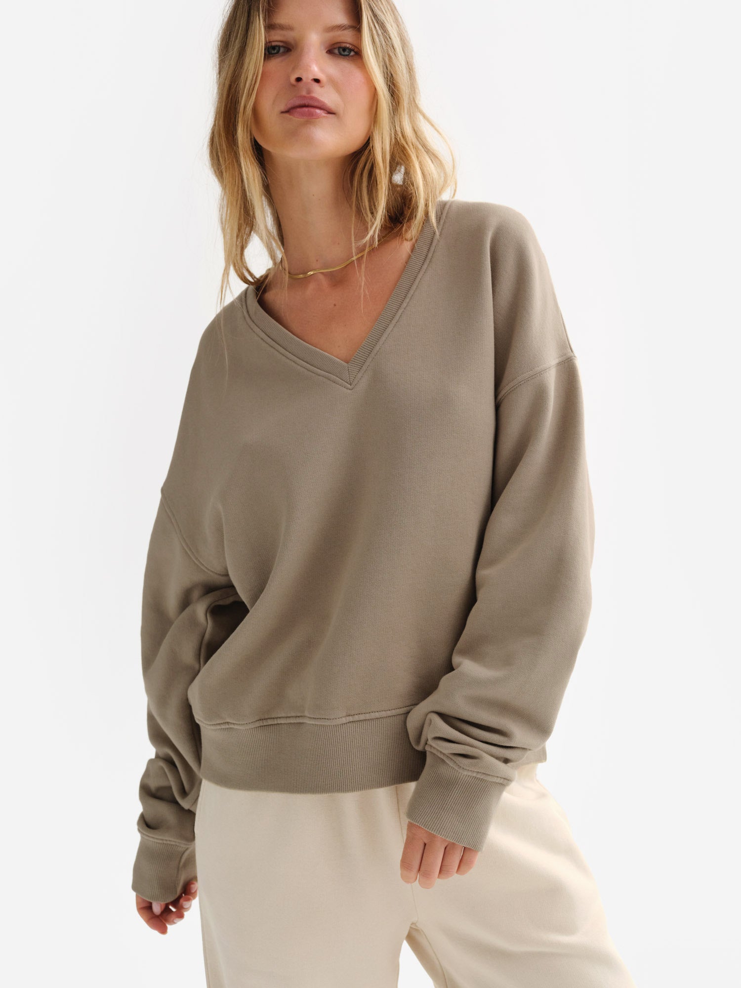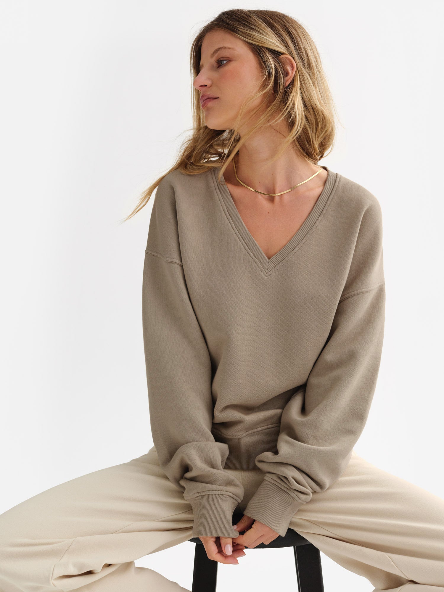 GOTS Certified Organic Fleece V-Neck Sweatshirt. V-Neck sweatshirt with dropped shoulder and easy fit. Rib trim at v-neck, sleeve cuffs and bottom hem.