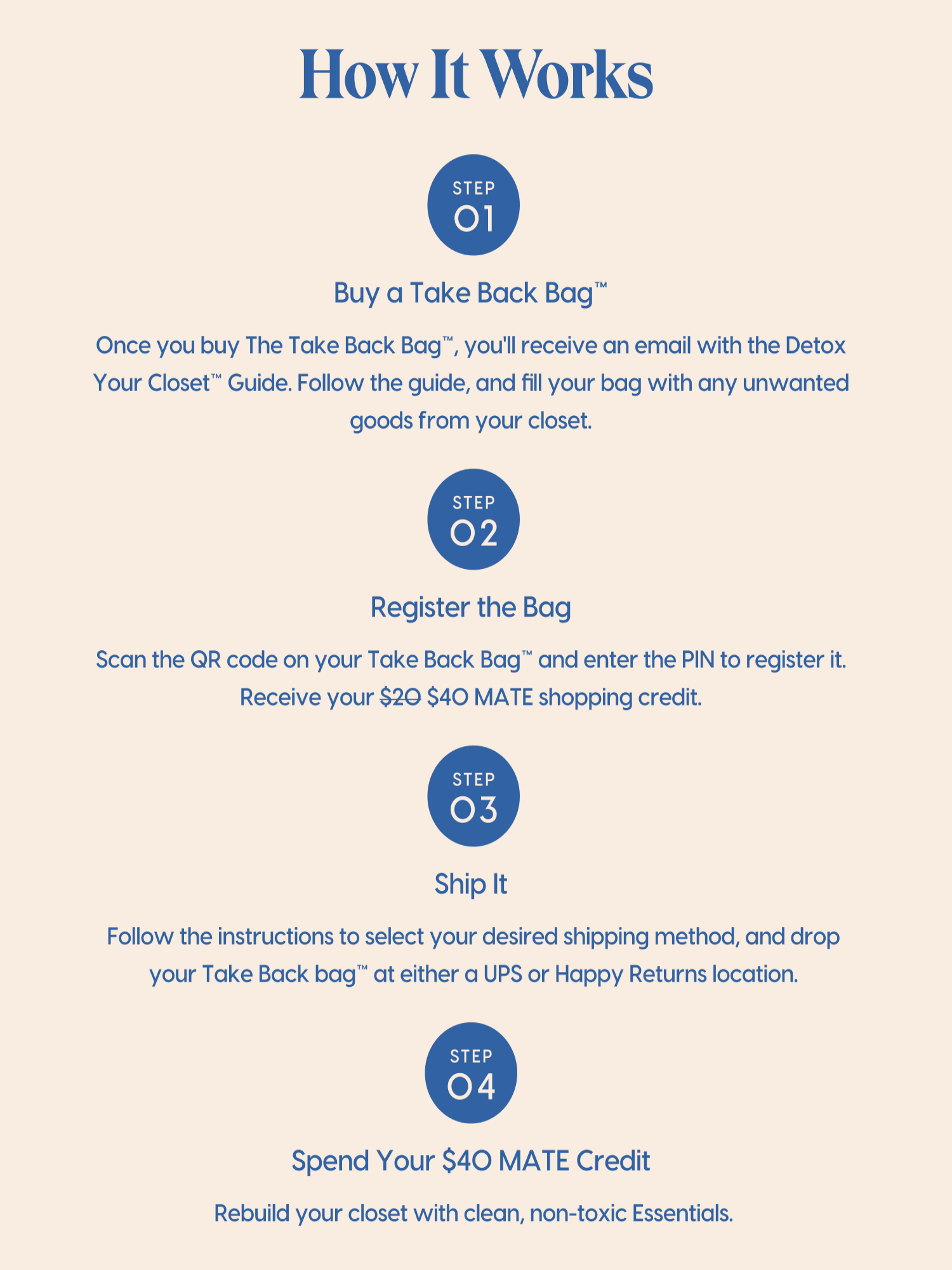 Let's Detox Your Closet™. Here's what to do: order a Take Back Bag, clean out your closet, and send us your filled bag. You'll earn $40 in MATE shopping credit (for the month of January) towards your next purchase when you register your Take Back Bag.
